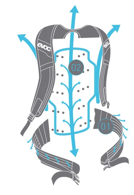 Der extrabreite, ergonomisch geformte 01 HĂŒftgurt besteht aus unserem AIRO FLEX Material. So wird die Hauptlast â auch die eines voll beladenen Rucksacks â auf die HĂŒfte ĂŒbertragen und dort fixiert. Gleichzeitig ist optimale AtmungsaktivitĂ€t garantiert. Dieses System vereint die fĂŒr einen RĂŒckenprotektor absolut notwendige KörpernĂ€he mit einem HöchstmaĂ an BelĂŒftung: Der eng anliegende RĂŒckenbereich ist neben einem groĂen zentralen BelĂŒftungskanal mit zwei Reihen âEntlĂŒftungsgitternâ versehen: Mit Air-Mesh abgedeckte 02 EVA-Schaum-Streifen mit BelĂŒftungslöchern und einer speziellen, schrĂ€gen GiebelfrĂ€sung reduzieren die KontaktflĂ€che zum RĂŒcken und verbessern so die Luftzirkulation.