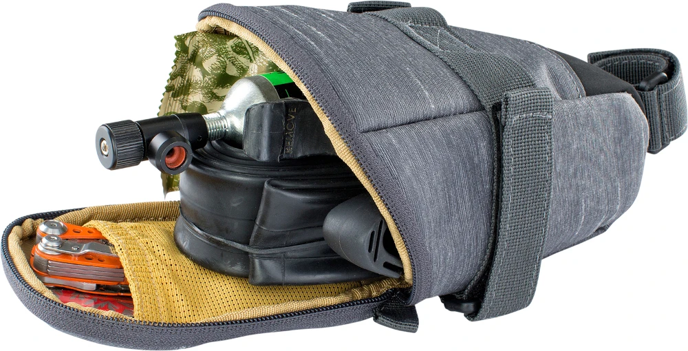 Die leichte Satteltasche aus stark wasserabweisendem Material lĂ€sst sich mit einem Klettverschluss einfach an regulĂ€re SattelstĂŒtzen montieren und bietet ausreichend Platz fĂŒr Werkzeug und Ersatzschlauch