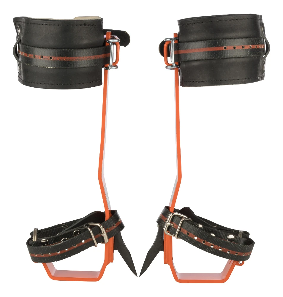 Stahlsteigeisen mit weichem kurzem Wadenpolster aus Leder und Filz sowie austauschbaren Dornen aus gehärtetem Stahl. Die verstellbaren Befestigungsriemen sind wasserdicht beschichtet. Das Metall ist pulverbeschichtet. Das Baumsteigeisen wurde speziell für den professionellen und gewerblichen Einsatz im Bereich Forst und Baumpflege konzipiert. Die Wadenpolster verhindern Druckstellen an den Beinen. Die Form wurde dem menschlichen Bein angepasst, somit sind auch längere Einsätze kein Problem. Mit 2 kurzen Dornen und 2 langen Dornen, die sich je nach Einsatzzweck und Baumart einfach und schnell tauschen lassen. Durch das geringe Gewicht von nur ca. 2 kg pro Steigeisen (Paar 4 kg), sind sie leicht zu handeln und belasten im Einsatz kaum.