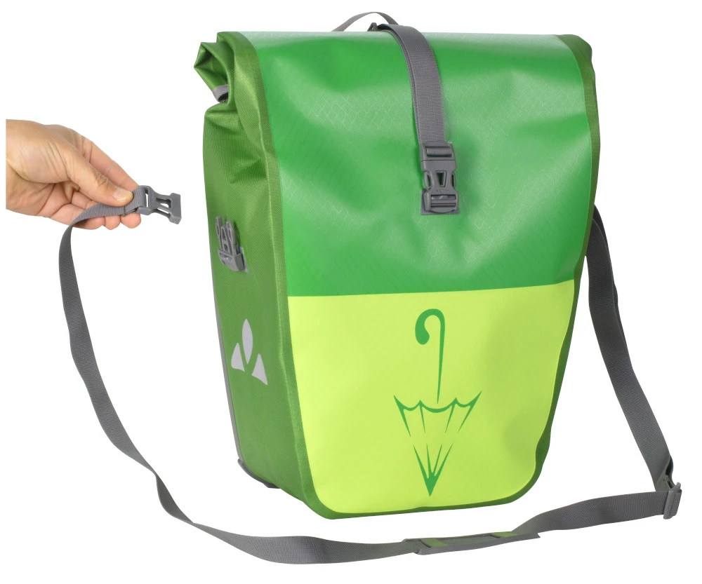 Die wasserdichte Hinterradtasche mit dezenter Colorblock-Optik wird aus robustem, PVC-freiem Planen-Material klimaneutral am deutschen VAUDE-Standort in der Nähe des Bodensees hergestellt. Sie lässt sich durch den Wickelverschluss auf individuelle Größen bringen und absolut dicht verschließen. Für Übersichtlichkeit sorgt eine einfache Innentasche. Die Radtasche wird mit dem QMR 2.0-System und stabiler Rückenplatte rechts oder links am hinteren Gepäckträger befestigt, ist einfach über ein Handrädchen justierbar und lässt sich schnell und einfach abnehmen. Mit einem Fahrradschloss kann sie direkt am QMR-Haken verriegelt werden. Reflexelemente sorgen für eine gute Sichtbarkeit im Straßenverkehr. Kann durch diese praktischen Zubehör-Taschen ergänzt werden: Toolbag Back, Sortyour Back, Addita Bag.