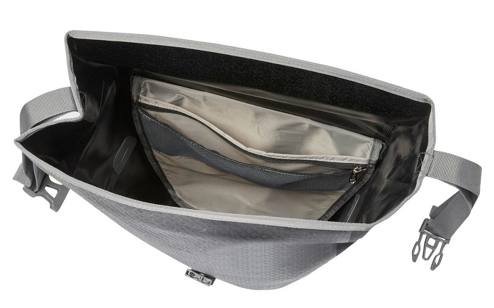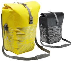 Die wasserdichte Hinterrradtasche mit großem, stark reflektierenden Druck wird aus robustem, PVC-freiem Planen-Material am deutschen VAUDE-Standort in der Nähe des Bodensees im Hochfrequenz-Schweißverfahren hergestellt. Sie lässt sich durch den Wickelverschluss auf individuelle Größen bringen und absolut dicht verschließen. Für Übersichtlichkeit sorgt eine Innentasche mit kleinen, aufgesetzten Reißverschluss-Netztaschen. Die Radtasche wird mit dem QMR 2.0-System und stabiler Rückenplatte am hinteren Gepäckträger befestigt. Ein Zug am die beiden Haken verbindenden Band öffnet das System komfortabel. Das mit einem kleinen Schloss (z. B. Abus 145/10, nicht im Lieferumfang enthalten) absperrbare System ist einfach über Handrädchen justierbar und wird durch den flexibel einstellbaren, unteren Rail Hook komplettiert. Ein praktischer Schultergurt erleichtert den Transport zu Fuß. Für Pendler, die auch in Dämmerung und Dunkelheit unterwegs sind, ist diese stark reflektierende Radtasche ein Must have für den täglichen Weg zur Arbeit. Zudem ist dieses Produkt klimaneutral: Die Emissionen aus Materialien, Herstellungsprozess und Versand wurden ganzheitlich ermittelt und systematisch reduziert. Aktuell nicht vermeidbare Emissionen wurden vollständig über die unabhängige Non-Profit-Organisation „myclimate“ kompensiert.