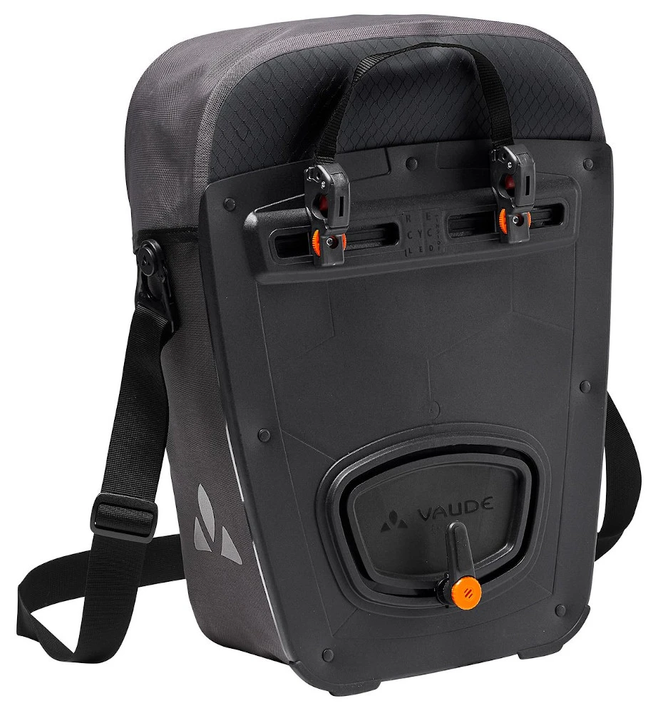 Die umweltfreundliche Rückenplatte besteht vollständig aus recyceltem Material: Hierbei wird in einem innovativen Recyclingverfahren neuer, langlebiger Rohstoff erzeugt. Die dadurch äußerst stabile Rückenplatte wurde mit dem leicht bedienbaren QMR 2.0-System ausgestattet, damit die Tasche mit einem Handgriff an- und abgemacht werden kann. Die Befestigung ist über einfach bedienbare Handrädchen justierbar und passt somit auf jeden Gepäckträger bis 16 mm Rohrdurchmesser. Mit dem abschließbaren QMR 2.0 Befestigungssystem