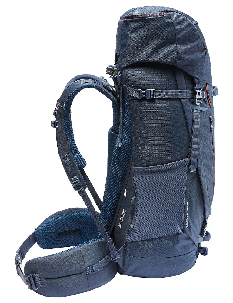 Mit viel Stauraum und jeder Menge Tragekomfort eignet sich der Rucksack für Trekking- oder Fernreisen mit viel Gepäck. Vor allem große Personen profitieren von dem großen Modell mit satten 70 Liter Packvolumen. Das Tergolight Comfort Space-Tragesystem und der dick gepolsterte Hüftgurt verteilen die Last optimal und sorgen zusammen mit der verstellbaren Rückenlänge für perfekten Sitz. Der Spalt in der unteren Rückenpolsterung reduziert den Druck auf das Iliosakralgelenk und entlastet den unteren Rücken. Dank der Ergoshape-Schultergurte bleibt genug Bewegungsfreiheit für die Arme. Beim Backpacking punktet der Rucksack mit den gepolsterten Tragegriffen, an denen er angehoben werden kann. Der großzügige Frontzugriff lässt sich wie bei einem Koffer öffnen, kein lästiges Kramen beim Backpacking im Hostel. Das Gepäck im Hauptfach kann lässt sich durch die Abtrennung organisieren. Schmutzwäsche kann im abtrennbaren Bodenbereich separat verstaut werden. Die elastischen Seitentaschen sind auch bei aufgesetztem Rucksack erreichbar, sodass Trinkflasche und Karten mit einem Griff zur Hand sind. An den Materialschlaufen kann zusätzliches Gepäck wie eine Isomatte befestigt werden, eine separate Halterung nimmt Trekkingstöcke auf. Die Fronttasche bietet Platz z. B. für ein kleines Handtuch. Der höhenverstellbare Deckel des Backpacks lässt sich abnehmen und zur Umhängetasche umfunktionieren. So passt der Rucksack beim Backpacking unter den Bussitz, während das Nötigste am Körper bleibt. Der Astrum EVO besteht überwiegend aus recycelten Materialien. Das VAUDE Green Shape-Label gewährleistet ein umweltfreundliches, funktionelles Produkt aus bluesign® zertifizierten, nachhaltigen Materialien.