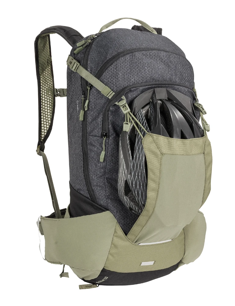 Mit dem umfangreich ausgestatteten 22 Liter Rucksack solltest Du keine Organisationsprobleme haben. Der Rucksack erfüllt all Deine Ansprüche für flowige Trailabfahrten. Für perfekten Sitz und gute Belüftung sorgen das Ventex Active Rückensystem und der flexible, komprimierbare Hüftgurt, der den Schwerpunkt des Rucksacks perfekt an den Rücken zieht. Die neu entwickelte, leicht gekrümmte EMP-Rückenplatte Ergonomic sorgt für einen perfekten Sitz mit optimaler Bewegungsfreiheit auf dem Rad. Der Rucksack ist in drei Fächer unterteilt. Neben dem großen Hauptfach für Regenbekleidung und Proviant ist ein separates Fach mit einem weichen Futter für Deine Brille eingearbeitet und bietet Platz für empfindliche Gegenstände. Das Fach auf der Rucksackfront ist mit einem herausnehmbaren Werkzeugfach ausgestattet, das Du bei einer Panne schnell und einfach griffbereit hast. In der Tasche am Hüftgurt hast Du zusätzlich Platz für Kleingeld oder Deine Powerriegel. Zur Ausstattung gehört zudem eine extra Regenhülle. Reflektierende Elemente sorgen bei schlechtem Wetter oder einbrechender Dunkelheit für extra Sichtbarkeit. Dieses Produkt ist mit Eco Finish umweltfreundlich wasserabweisend ohne Fluorcarbone (PFC) hergestellt. Das VAUDE Green Shape-Label steht für ein umweltfreundliches, funktionelles Produkt aus nachhaltigen Materialien.