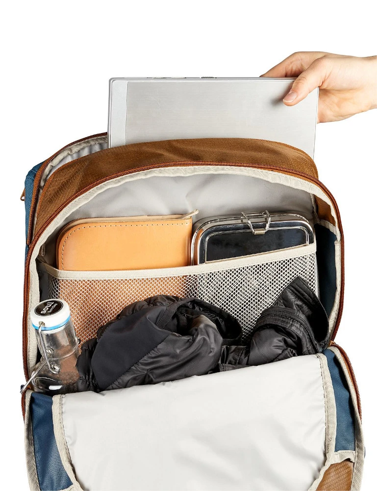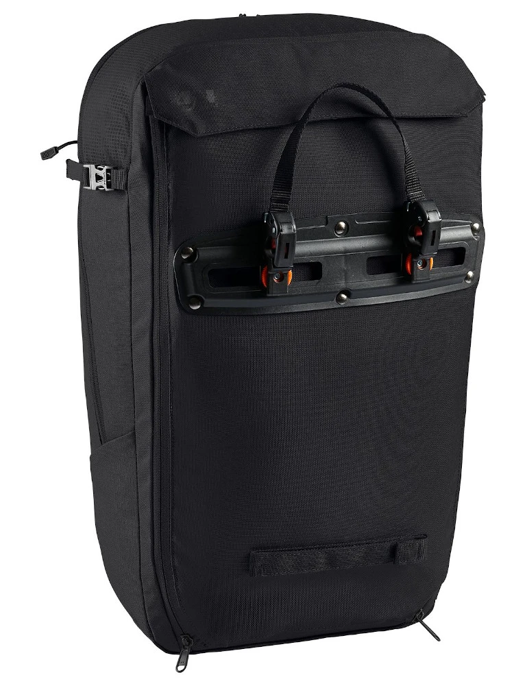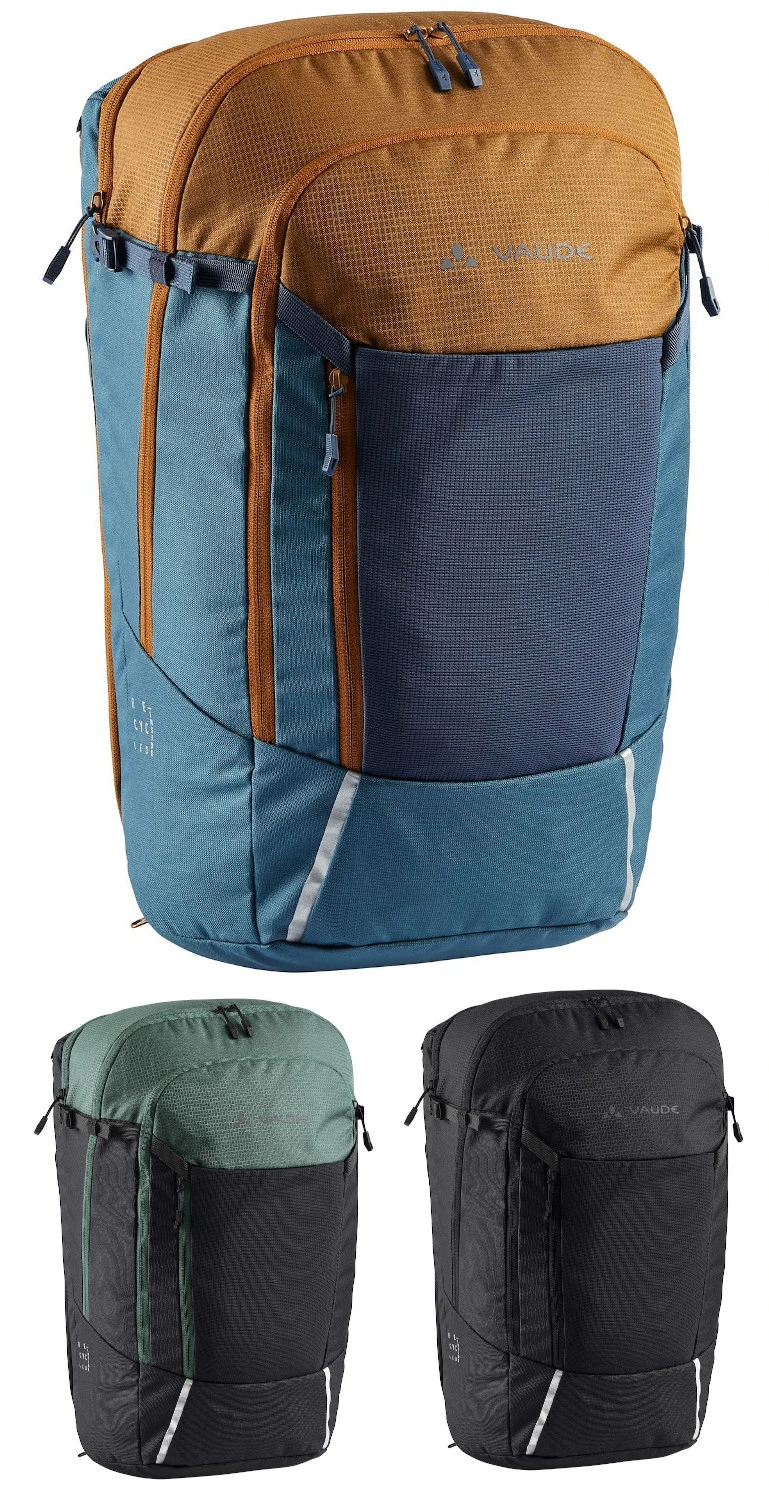 Der Cycle 28 ist der ideale Begleiter fĂŒr Commuter, die wĂ€hrend der Fahrt einen sicheren Sitz der Tasche am Rad wĂŒnschen, sie dann aber in Bahn und Bus oder der Uni als Rucksack tragen möchten. Die Tasche wird ĂŒber die mit einem Schloss absperrbaren QMR-Haken (z. B. Abus 145/20, nicht im Lieferumfang enthalten) am GepĂ€cktrĂ€ger befestigt und ist im Handumdrehen zum Rucksack umgebaut. Dazu werden die beiden vertikalen ReiĂverschlĂŒsse geöffnet und das gesamte Befestigungssystem in einem mit Klett verschlossenen Fach verstaut. Die Umbaufunktion wird auf einem eingenĂ€hten, leicht entfernbaren Etikett in wenigen Schritten erlĂ€utert. Die clevere Rucksack-Radtaschen-Kombination bietet aber noch mehr. Im Vergleich zum kleineren Bruder Cycle 20 deutlich gröĂerem Hauptfach findet neben DIN A4 Unterlagen, Trinkflasche und Brotzeit auch WechselwĂ€sche Platz. Ein separates, mit ReiĂverschluss verschlossenes, gepolstertes Fach nimmt Laptops bis 15,6â auf. Ein ĂŒber die gesamte Front reichendes Fach öffnet diagonal und bietet einen Netzorganizer fĂŒr Handy, SchlĂŒssel und Geldbeutel. Auf diesem Fach befindet sich zusĂ€tzlich eine flache Netztasche fĂŒr das schnelle Verstauen von Zeitschriften oder nasser Kleidung. Zwei seitliche Kompressionsriemen, ein Helmhalter sowie ansprechend ins Design integrierte reflektierende Elemente runden die Komfortausstattung ab. Das Hauptmaterial des Cycle 20 besteht aus 50 % recyceltem Polyester, das Kontrastmaterial sogar zu 100 %. Unser VerwandlungskĂŒnstler ist mit EcoFinish PFC-frei wasserabweisend ausgerĂŒstet. Das VAUDE Green Shape-Label steht fĂŒr ein umweltfreundliches, funktionelles Produkt aus nachhaltigen Materialien.