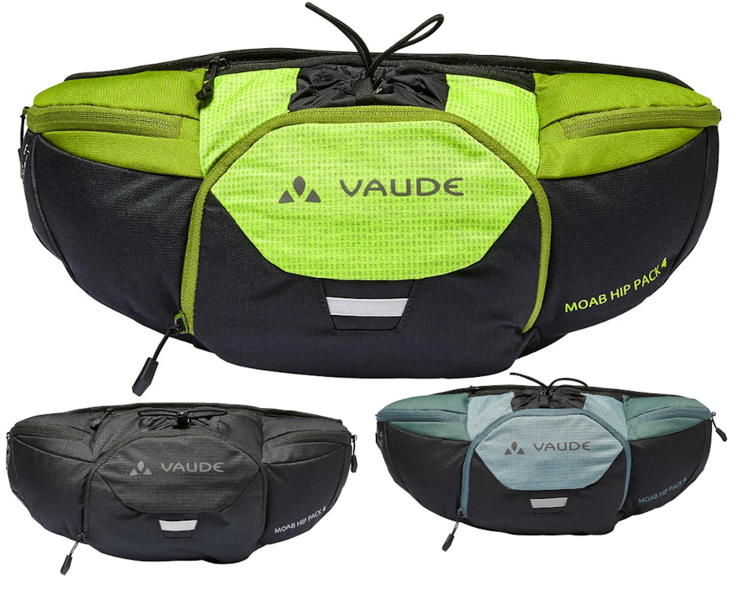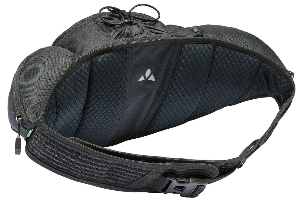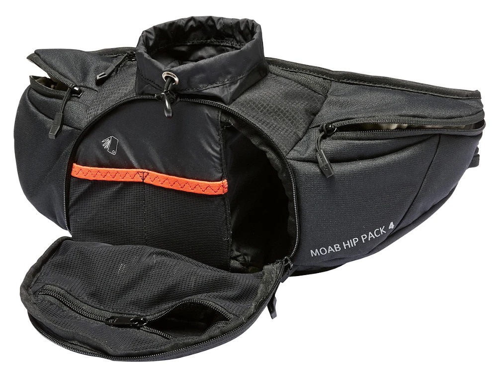 Der coole Moab Hip Pack wurde speziell für Biker entwickelt, die auf der sportlichen Feierabendtour nur das Nötigste dabeihaben wollen. Egal, ob Gravel, Enduro oder Crosscountry: Auf dieses ultimative Accessoire will man nicht mehr verzichten. Die sportlich geschwungene Hüftgurttasche passt sich durch den elastischen Hüftgurt jeder Figur und jeder Fahrlage an. Komfortable Polsterflächen vermeiden Druckpunkte im Rückenbereich. Für eine optimale Gewichtsverteilung wurde der Trinkflaschenhalter mit Staubalg mittig platziert, 2 mit Reißverschluss verschlossene Seitentaschen schmiegen sich perfekt um den Hüfbereich. Herzstück der Tasche bildet das mittlere Frontfach mit seiner ausgeklügelten Aufteilung. Im Frontflap befindet sich ein Mesh-Reißverschlussfach, 2 Steckfächer organisieren das Werkzeug und ein extra für den Ersatzschlauch vorgesehenes Fach sorgt für Ordnung. Zwischen dem gepolsterten Rücken und dem Trinkflaschenfach wurde eine Reißverschluss-Tasche für Wertsachen integriert. Wird die Trinkflaschenhalterung nicht benötigt, findet in ihr auch ein Ersatztrikot oder eine Windjacke Platz. Eine Regenhülle für Schutz vor Schauern und Schmutz sowie ein reflektierender Webbingloop und das reflektierende VAUDE Logo runden dieses Komfortpaket mit 4 l Volumen ab. Alle verwendeten, bluesign®-zertifizierten Materialien bestehen aus recyceltem Polyester.