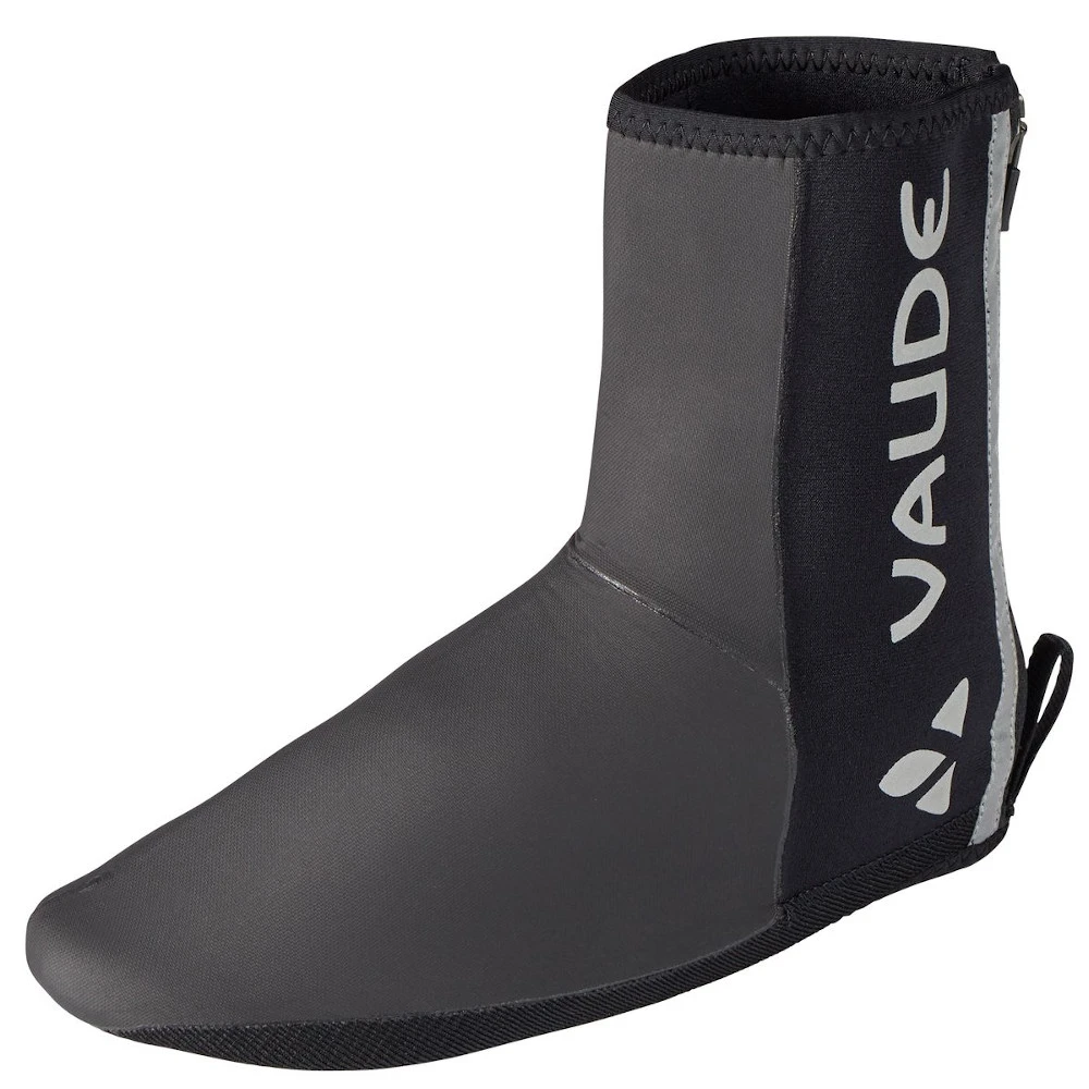 Ob in der Freizeit oder auf dem Weg zur Arbeit schützt dieser Schuhüberzieher sowohl Schuhe als auch Füße durch eng anliegendes, in der Front verschweißtes Neopren. Der hintere Reißverschluss öffnet unten nicht ganz, was den Ein- und Ausstieg, von einer Haltschlaufe unterstützt und sehr einfach möglich macht. Die breite Verschlussleiste und das VAUDE Logo sind für bessere Sichtbarkeit beim Pedalieren reflektierend. Die Unterseite ist verstärkt, um bei notwendigem Halten oder wenigen Schritten Beschädigungen zu vermeiden
