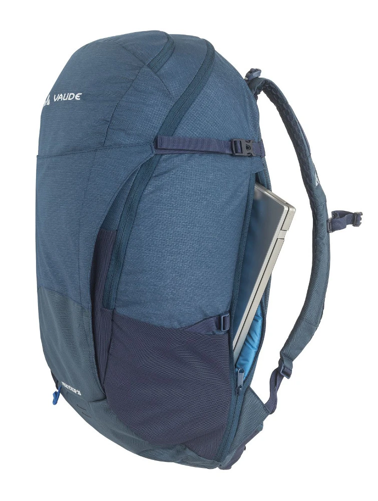 Der Rucksack bietet ausreichend Platz für kompakte Hikes und Bergtouren, lässt sich unkompliziert bedienen und wird Dich auch jenseits der Berge auf Schritt und Tritt begleiten.Der Prokyon Zip 28 verfügt über ein durchdachtes Rückensystem (Vent Active Hike), das für ein Maximum an Bewegungsfreiheit beim Wandern und Bergsteigen sorgt. Der große Zip-Zugang zum Hauptfach ist nicht nur praktisch, sondern sorgt auch für eine geradlinige, aufgeräumte Optik. Neu in der Prokyon-Serie ist die geräumige Fronttasche, in der Dinge, die schnell zur Hand sein müssen, unkompliziert Platz finden. Auf längeren Wanderungen sorgen die durchdachten Ergo Shape-Schultergurte für ein Maximum an Tragekomfort. Der Prokyon 28 Zip verfügt daneben über praktische Details wie ein Kompressionssystem, eine Halterung für ein Fahrradblinklicht sowie ein gepolstertes Tablet- bzw. Trinkblasenfach das auch als Laptopfach genutzt werden kann. Die integrierte Regenhülle schützt vor plötzlichen Schauern und Wolkenbrüchen. Wer einen sportlichen Allround-Rucksack sucht, er auch im Alltag und in der Stadt hervorragend funktioniert, der findet mit dem Prokyon Zip 28 einen besten Freund. Das VAUDE Green Shape-Label steht für ein umweltfreundliches, funktionelles Produkt aus nachhaltigen Materialien.
