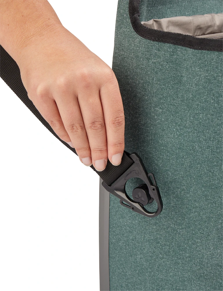 Den Entwicklern von Vaude ist es gelungen, alle Befestigungskomponenten aus einem recycelten Kunststoff fertigen zu lassen. Die Hardback-Platte besteht zu 64 % aus recyceltem Material aus Haushaltsabfällen. Das robuste, zu 100 % recycelte Taschen-Material in textiler Optik ist komplett PVC-frei und wasserdicht verschweißt. Die stylishe Tasche im Shopper-Design kommt mit stabilen, weich mit recyceltem Polyesterband überzogenen Griffen, einem Rundhalsausschnitt für einen vergrößerten Eingriff und einem Staubalg aus recyceltem Material zur besseren Fixierung des Inhaltes. Der abnehmbare Schultergurt und reflektierende Logos runden die Ausstattung ab. Die Tasche ist Bestandteil des Made in Germany Sortimentes, was heißt, dass sie klimaneutral am Firmenstandort in Deutschland hergestellt wird.