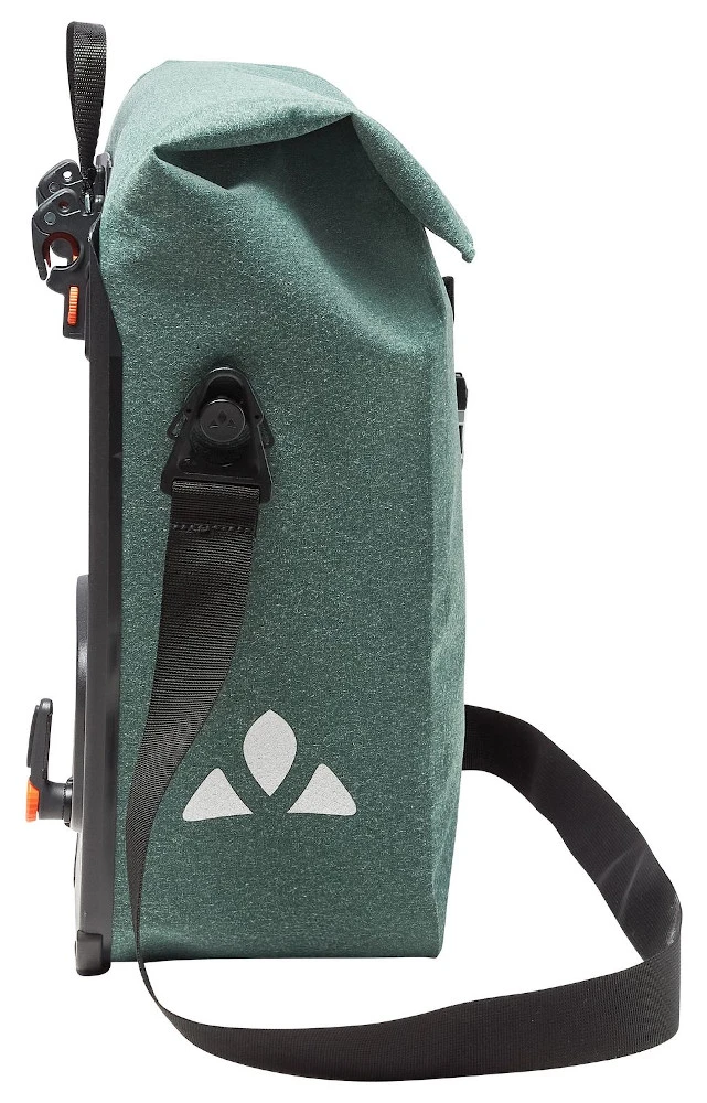 Die stylische, wasserdicht verschweißte ReCycle Commute Single ist ein durch und durch nachhaltiger Alltagsbegleiter für Radpendler! Satte 22 Liter Volumen und die umfangreiche Innenausstattung mit separatem Laptopfach verstauen gut organisiert alles, was man im Stadtalltag so braucht: Laptop bis 13,3″, Wechselbekleidung, Jacke, Snack und Unterlagen. Kleinere Utensilien wie Handy, Geldbeutel und Schlüssel finden in den Zusatzfächern Platz. Durch die ausgesteifte Seitenwange kann die Tasche kippsicher abgestellt werden. Die Rückenplatte besteht aus recycelten Kunststoffverpackungen. Hierbei wird in einem innovativen Recyclingverfahren neuer, langlebiger Rohstoff erzeugt. Die dadurch äußerst stabile Rückenplatte wurde mit dem leicht bedienbaren QMR 2.0 System ausgestattet, damit die Tasche mit einem Handgriff an und abgemacht und zudem wahlweise rechts oder links am hinteren Gepäckträger befestigt werden kann. Die Befestigung ist über einfach bedienbare Handrädchen justierbar und passt somit auf jeden Gepäckträger bis zu einem Durchmesser von 16 mm. Mit dem abschließbaren QMR 2.0 Befestigungssystem kann die Tasche sicher am Fahrrad verriegelt werden. Sie ist zudem mit reflektierenden Elementen bedruckt. Bereits enthalten ist ein Schultergurt für den Transport zu Fuß für Umweltfreunde ist diese Radtasche somit das Nonplusultra für den täglichen Weg zur Arbeit. Dieses Produkt ist klimaneutral. Die Emissionen aus Materialien, Herstellungsprozess und Versand wurden ganzheitlich ermittelt und systematisch reduziert. Aktuell nicht vermeidbare Emissionen wurden vollständig über die unabhängige Non-Profit-Organisation „myclimate“ kompensiert