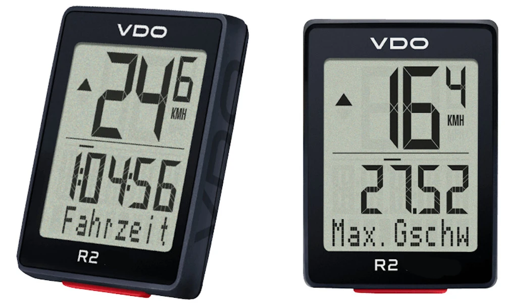 Mit dem kabellosen Fahrradcomputer aus der VDO R-Serie haben Radfahrer auf dem Weg ins Büro, bei der Trainingsrunde oder der Ausfahrt am Wochenende die zehn wichtigsten Werte ihrer Tour stets im Blick. Der wasserdichte Fahrradcomputer zeigt Strecke, Geschwindigkeit, Fahrzeit, Uhrzeit, Gesamtfahrzeit, Durchschnittsgeschwindigkeit und die aktuelle Temperatur an. Als besonderes Features gibt der Radtacho auch den Durchschnittsgeschwindigkeits-Vergleich und die Maximalgeschwindigkeit an. So werden Radfahrer dazu motiviert, schneller in die Pedale zu treten und ihre eigenen Geschwindigkeitsrekorde zu brechen. Das Einstellen sowie die Bedienung des R2 WL erfolgt ganz einfach durch die prominente rote Funktionstaste. Dank der vordefinierten Reifengrößen gelingt die Einstellung des Reifenumfangs mühelos. Die Lenkerhalterung für den wasserdichten Fahrradcomputer kann mit den im Lieferumfang enthaltenen Kabelbindern schnell am Fahrrad montiert werden. Der Bike Computer lässt sich im Anschluss bequem abnehmen und verstauen und somit vor Diebstahl schützen. Ein an der Gabel befestigter Funksender überträgt permanent und störungsfrei die am Rad gemessene Geschwindigkeit an den VDO R2 WL. Die integrierte auswechselbare Knopfbatterie (CR 2032) reicht aus, um den Funktacho weit über zwei Jahre mit Energie zu versorgen.